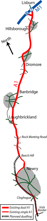 The line chosen for the M11 has been abandoned, making any plans to build it most unlikely in the short term. However, with the construction of the Irish M1 from Dublin to the border in the 1990s, there is growing political pressure in Northern Ireland to upgrade the A1 to motorway standard to match the standard south of the border. There is also the fact that the A1 is statistically the province's most dangerous road, with one death every 6 weeks in 2004, of which 80% occured on the then-single carriageway sections south of Loughbrickland.